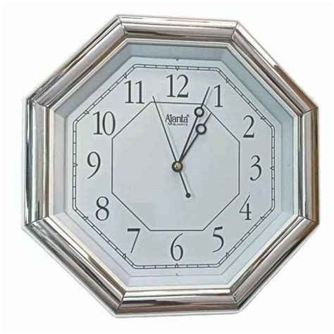 An octagonal fancy clock that features a numbering style that is standard and sharp, giving it a subdued appearance. A clock that focuses