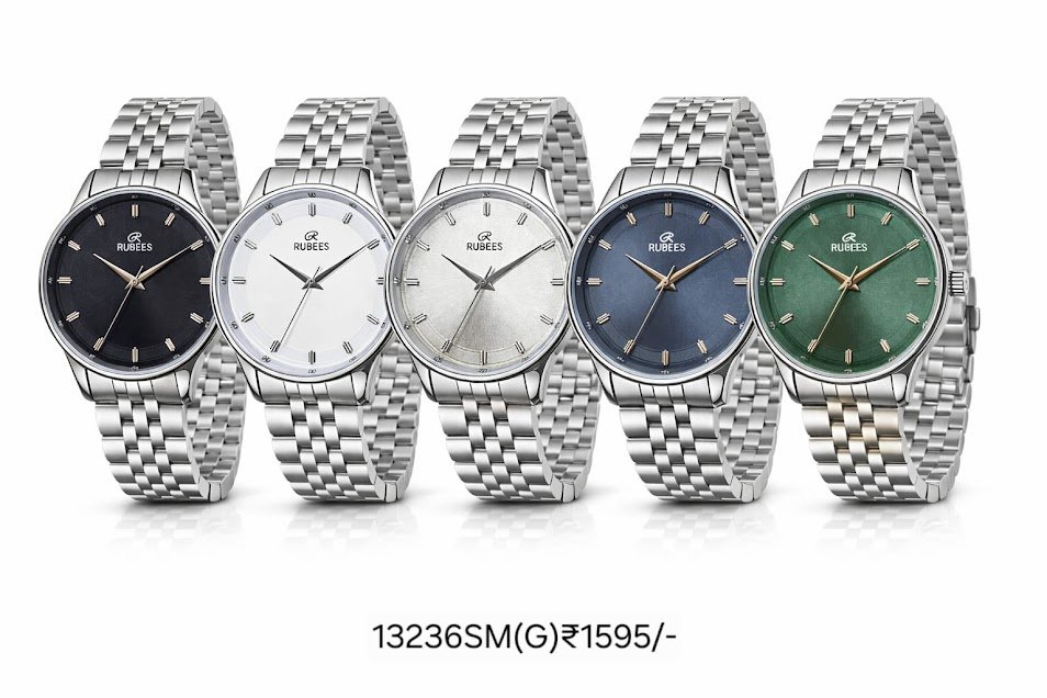 RUBEES 13236SM(G) gents wrist watch with silver metal strap, quartz analog movement, and multiple dial colors. Affordable elegance under ₹2000 with 1‑year warranty.