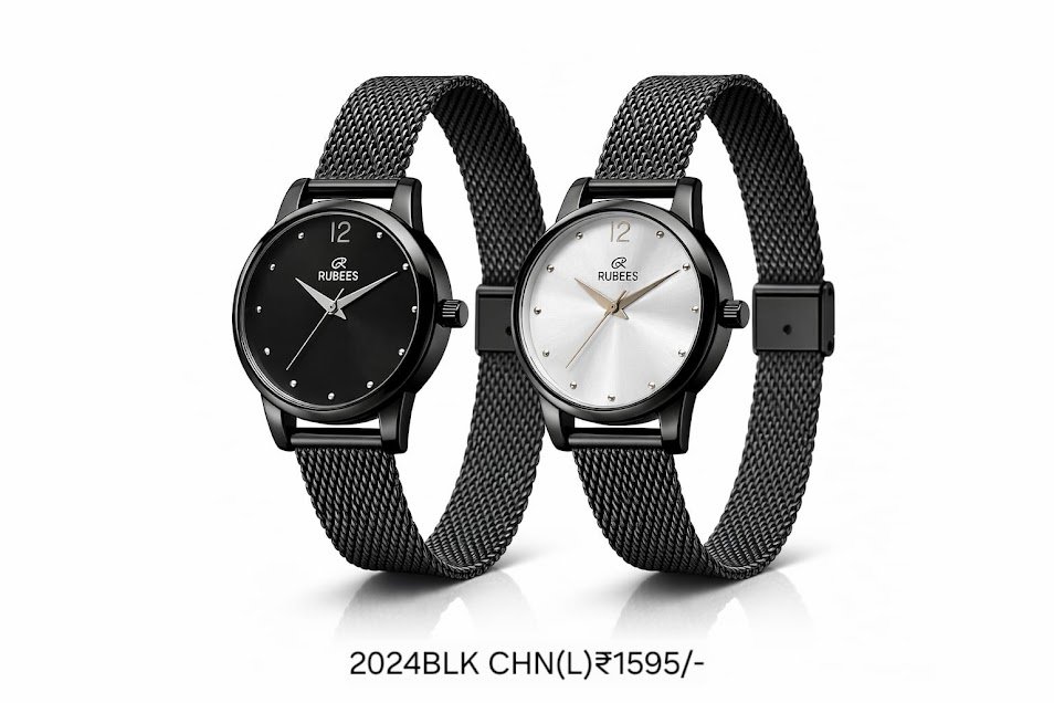 RUBEES 2024BLK CHN(L) ladies wrist watch with black mesh strap, quartz analog movement, and minimalist dial design. Affordable elegance under ₹2000 with 1‑year warranty.