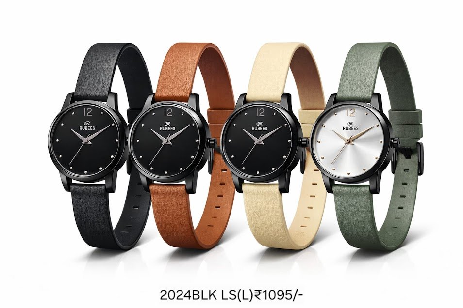 The RUBEES 2024BLK LS(L) wrist watch features a polished black case, minimalist dial with slender hands, and leather strap options in black, brown, beige, and green. Available in black or white dial variants, it offers timeless simplicity and quartz reliability. Priced at ₹1095, it’s a stylish everyday accessory backed by manufacturer warranty (if applicable).