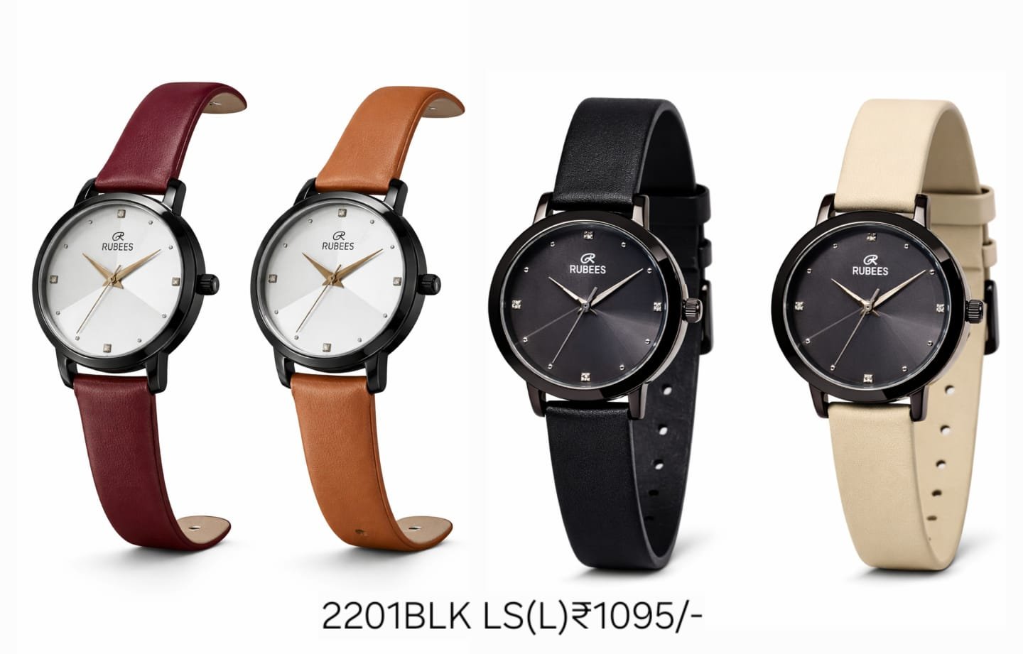 The RUBEES 2201BLK LS(L) wrist watch features a sleek black case, minimalist dial with square markers, and leather strap options in maroon, tan, black, and beige. Available in white or black dial variants, it offers timeless simplicity and quartz reliability. Priced at ₹1095, it’s a stylish everyday accessory backed by manufacturer warranty (if applicable).