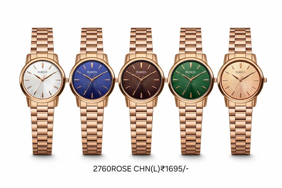 Elegant ladies wristwatch featuring a premium rose gold metallic strap and beautifully textured sunray dial. Available in multiple stylish dial colors, this watch offers a perfect blend of modern design, comfort, and reliable quartz performance—ideal for daily wear as well as special occasions.
