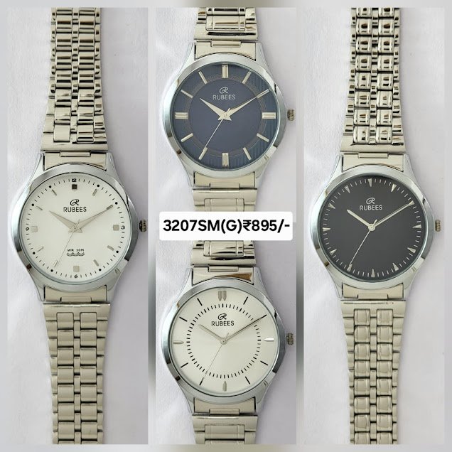 RUBEES 3207SM(G) gents wrist watch with silver metal strap, quartz analog movement, and multiple dial colors. Affordable elegance under ₹1000 with 1‑year warranty.