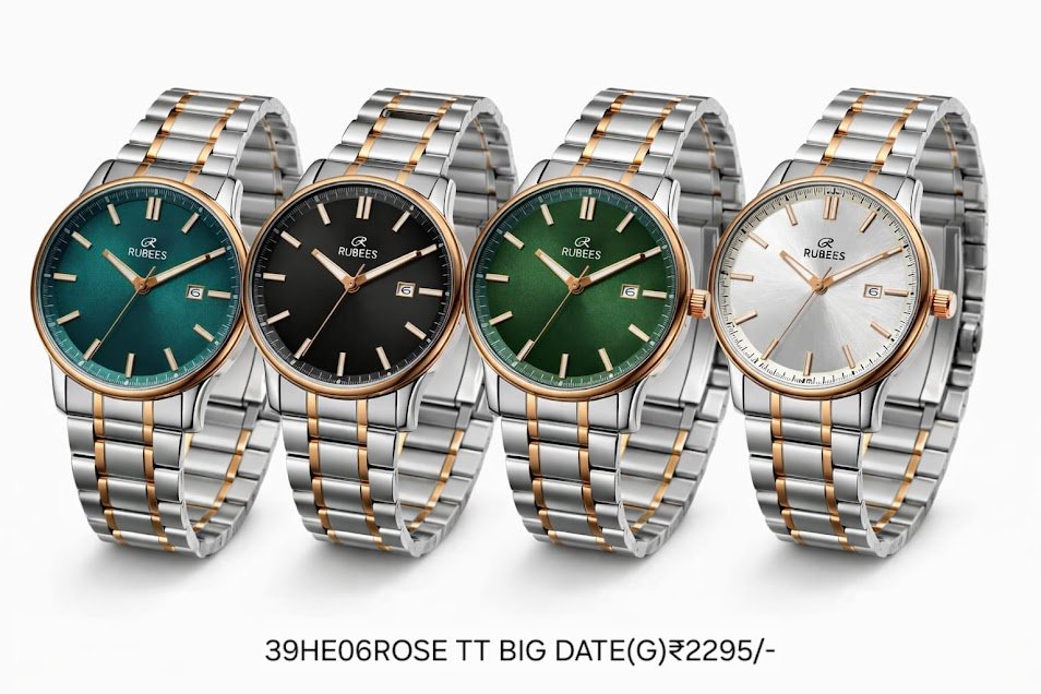 RUBEES 39HE06ROSE TT BIG DATE(G) gents wrist watch with two‑tone silver and rose gold strap, quartz analog movement, big date display, and multiple dial colors. Affordable elegance under ₹3000 with 1‑year warranty.