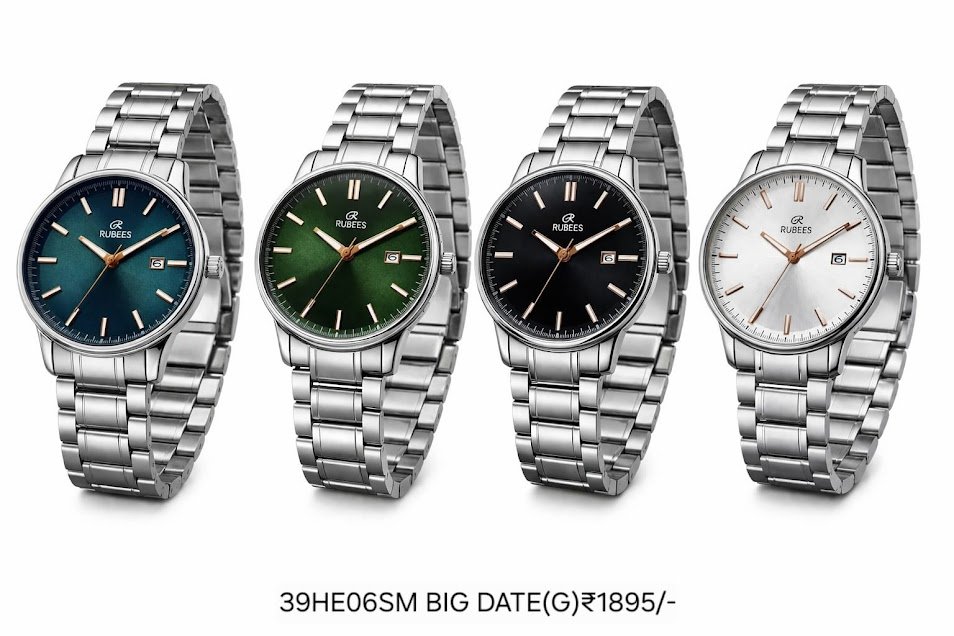 Tags: 1 Year Warranty, Analog, and multiple dial colors. Affordable elegance under ₹2000 with 1‑year warranty., Big Date Display, Quartz, quartz analog movement, RUBEES, RUBEES 39HE06SM BIG DATE(G) gents wrist watch with silver metal strap, Under ₹2000