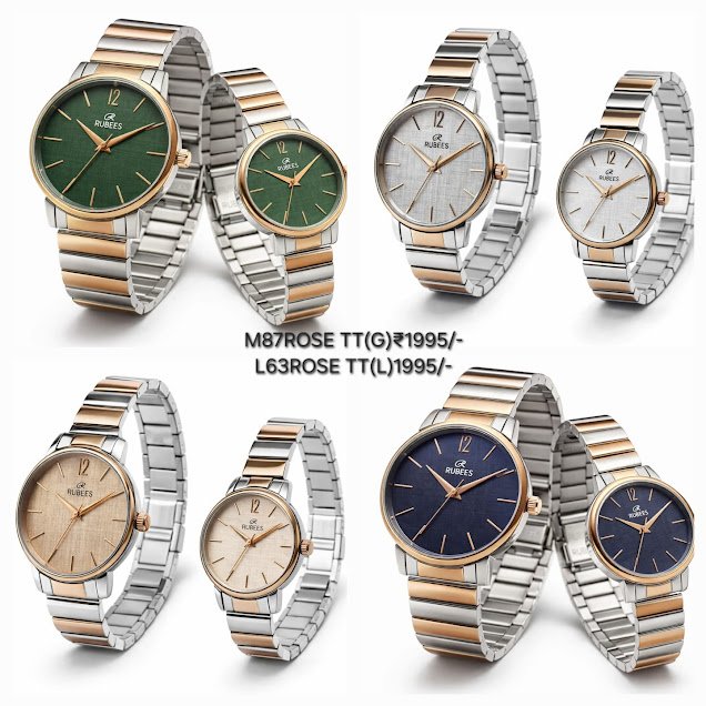 RUBEES M87ROSE TT(G) gents and L63ROSE TT(L) ladies wrist watches with two‑tone silver and rose gold straps, quartz analog movement, and multiple dial colors. Perfect matching watches under ₹2000 with 1‑year warranty.