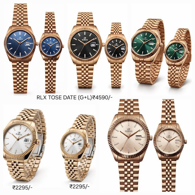RUBEES RLX TOSE DATE wrist watches available as couple sets (₹4590) and individual variants (₹2295). Gold‑tone straps, quartz analog movement, date display, and multiple dial colors. Premium elegance with 1‑year warranty.