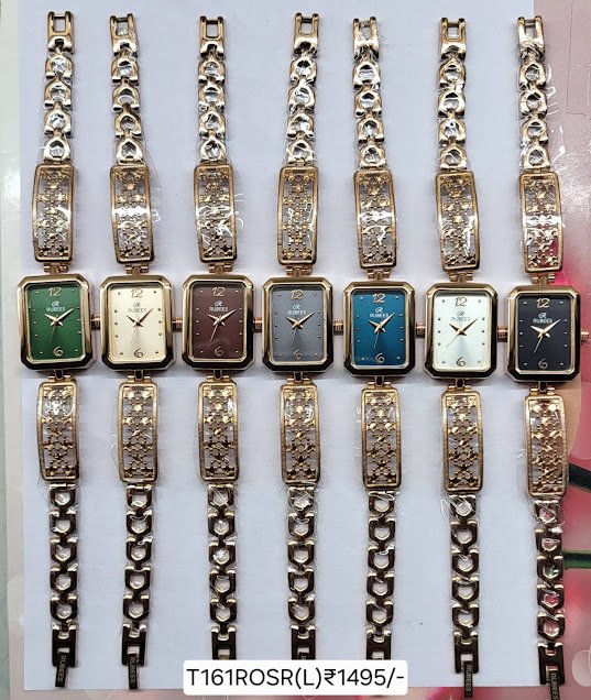 The RUBEES T161ROSR(L) ladies wrist watch features a gold bracelet‑style strap with decorative floral/crystal detailing and a rectangular case. Available in multiple dial colors including green, cream, brown, gray, blue, white, and black, it blends fashionable elegance with quartz reliability. Priced at ₹1495, it offers affordable sophistication backed by a 1‑year warranty.